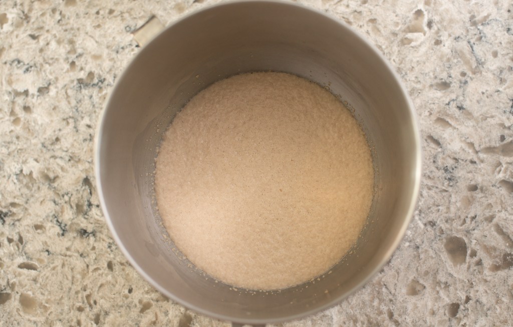 - Add warm water and milk to the large bowl of a stand mixer, then whisk in sugar until dissolved.
