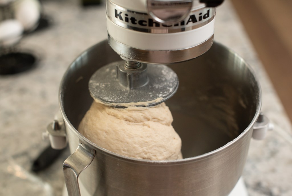 - Add bowl to stand mixer, then while running, add remaining flour 1 cup at a time.