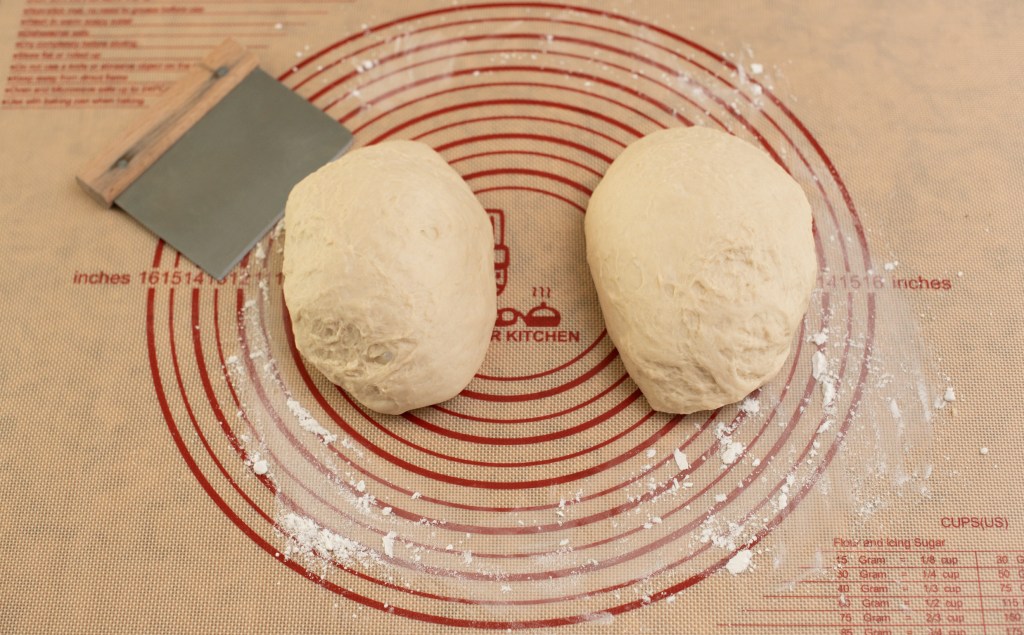 - Once dough has doubled, punch it down and knead by hand for 3 minutes, then divide the dough in half.