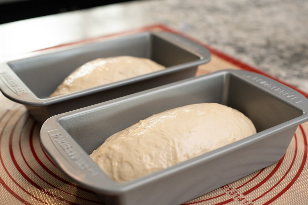 - Let rest for 5 minutes, then shape into loaves and place into 2 9×5 loaf pans.