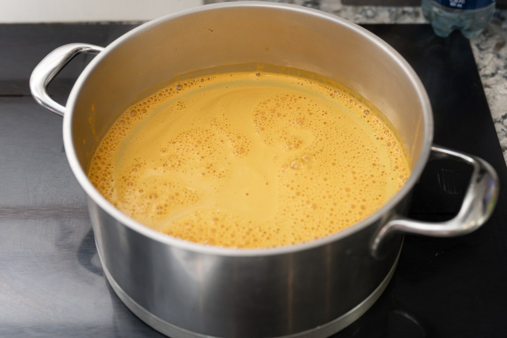 At this point, my house is absolutely stank. It would have been worse if I had added onions. So definitely open a window for the remainder of the dying. After about 30-45 minutes of a soft boil, scoop or strain out the vegetables. With the turmeric there is nothing to strain, so just whisk that in until it mostly dissolves.
