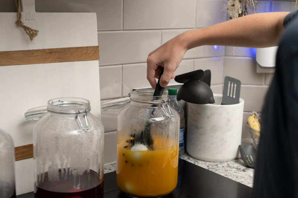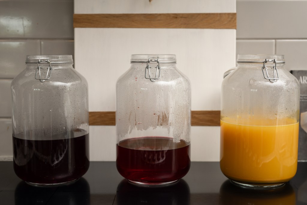 Then you’ll pour your liquids into large jars and slowly lower the eggs into the jars with a slotted spoon.