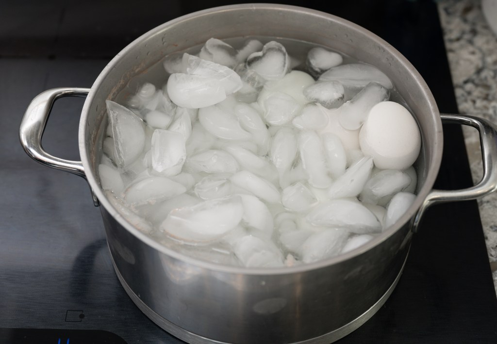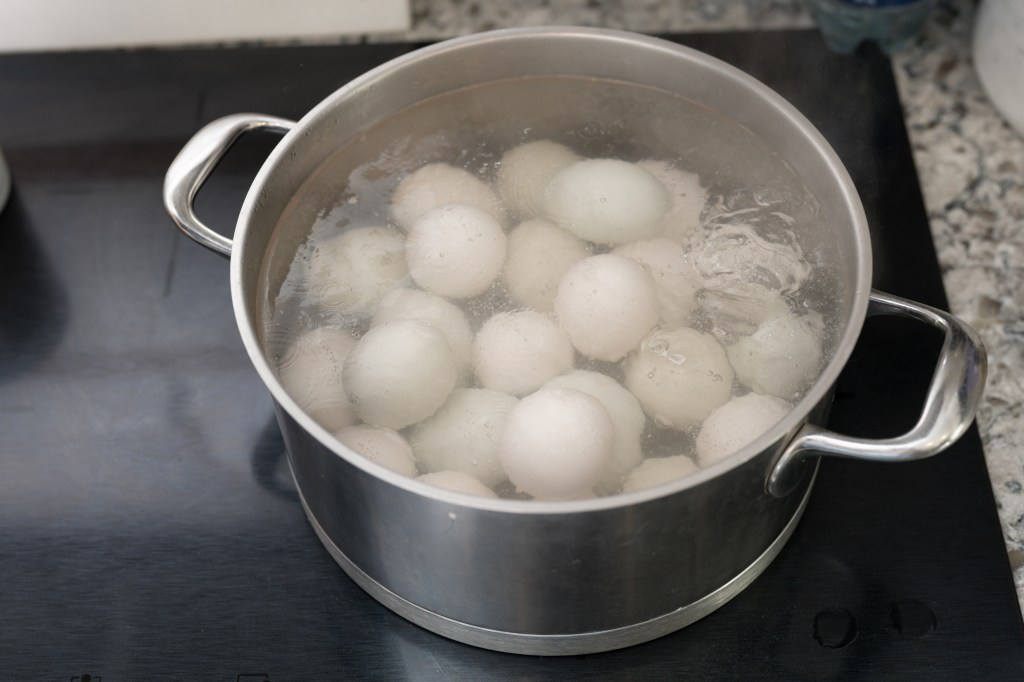 I coat the bottom of a large pot with salt prior to filling it with water. This makes the fresh eggs easier to peel. I don’t know how this works, but since I’ve started doing this, the shells just fall off when I peel the eggs. Then I fill the pot with water, lower the eggs in with a spoon and boil them for about 10 minutes. Immediately after I dump the boiling water out of the pot, I fill it with ice to cool the eggs.