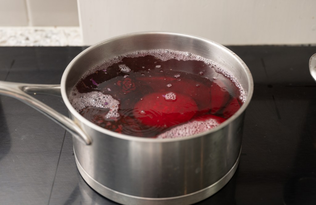 While the eggs are cooling in the ice bath, I start chopping all the foods I want to use for dyes. This year, I did beets, red cabbage, turmeric, and I was planning on using onion skins, but I didn’t have enough so I skipped those.