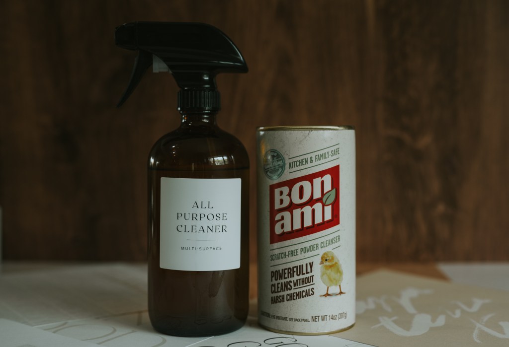 That bottle of all purpose cleaner? I made it. It cleaned counters, toilets, mirrors and windows…literally every surface. And for the really grimy places like inside of toilets and shower tile, Bon Ami and a scrub brush worked wonders. I can now say that cleaners that are actually “all natural” really do clean, and you don’t need to fill your house with all the chemicals and fragrance. Here is the recipe for the all purpose cleaner if you’d like to make some for yourself: